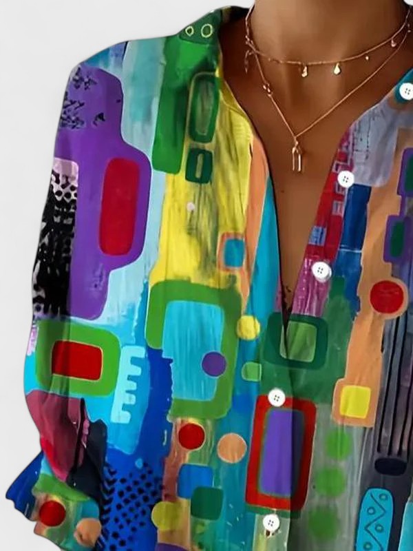 The button-front design adds practical versatility while the relaxed sleeves enhance the effortless feel, making this blouse ideal for casual styling, vacations, creative outfits, or simply elevating your everyday wardrobe with something visually unique yet easy to wear. The artistic multi-tone palette makes styling surprisingly simple, pairing naturally with denim, white trousers, skirts, or neutral bottoms.